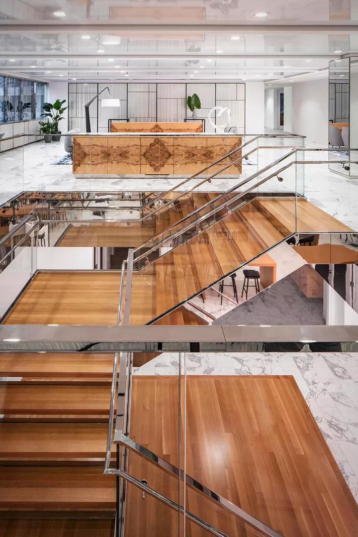 室內(nèi)裝修以通透的玻璃來制作隔墻,利于光和視線的穿透。黃褐色樹瘤橡木飾面板制作的接待前臺也是本案的一大看點,均衡對稱的蝴蝶紋樣的木紋圖形帶來戲劇化的視覺效果,猶如一張代表公司形象的藝術(shù)名片,令人為之驚嘆。